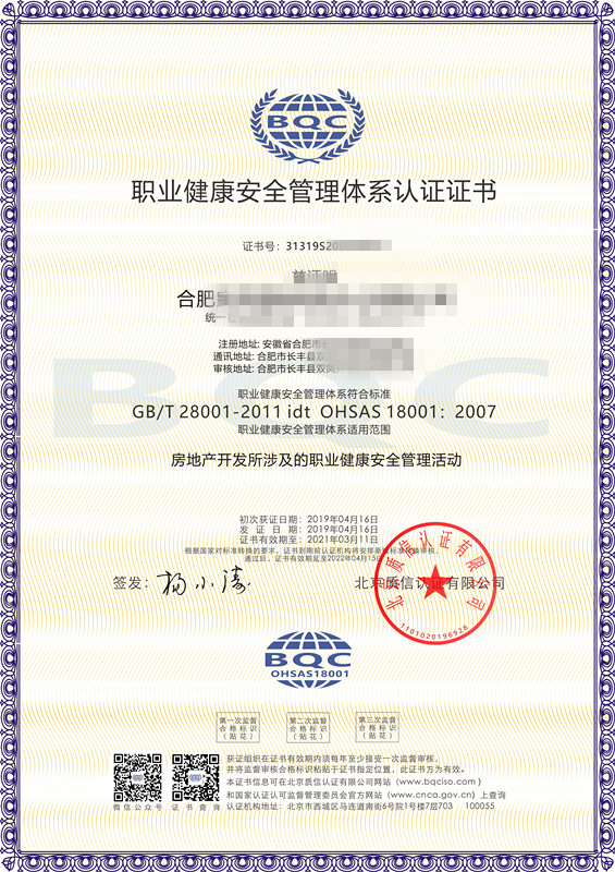 • 物業公司ISO三體系認證認證證書