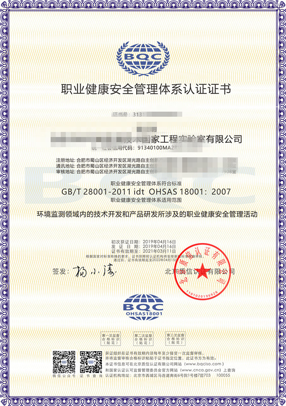 • 環境監測公司ISO三體系認證證書